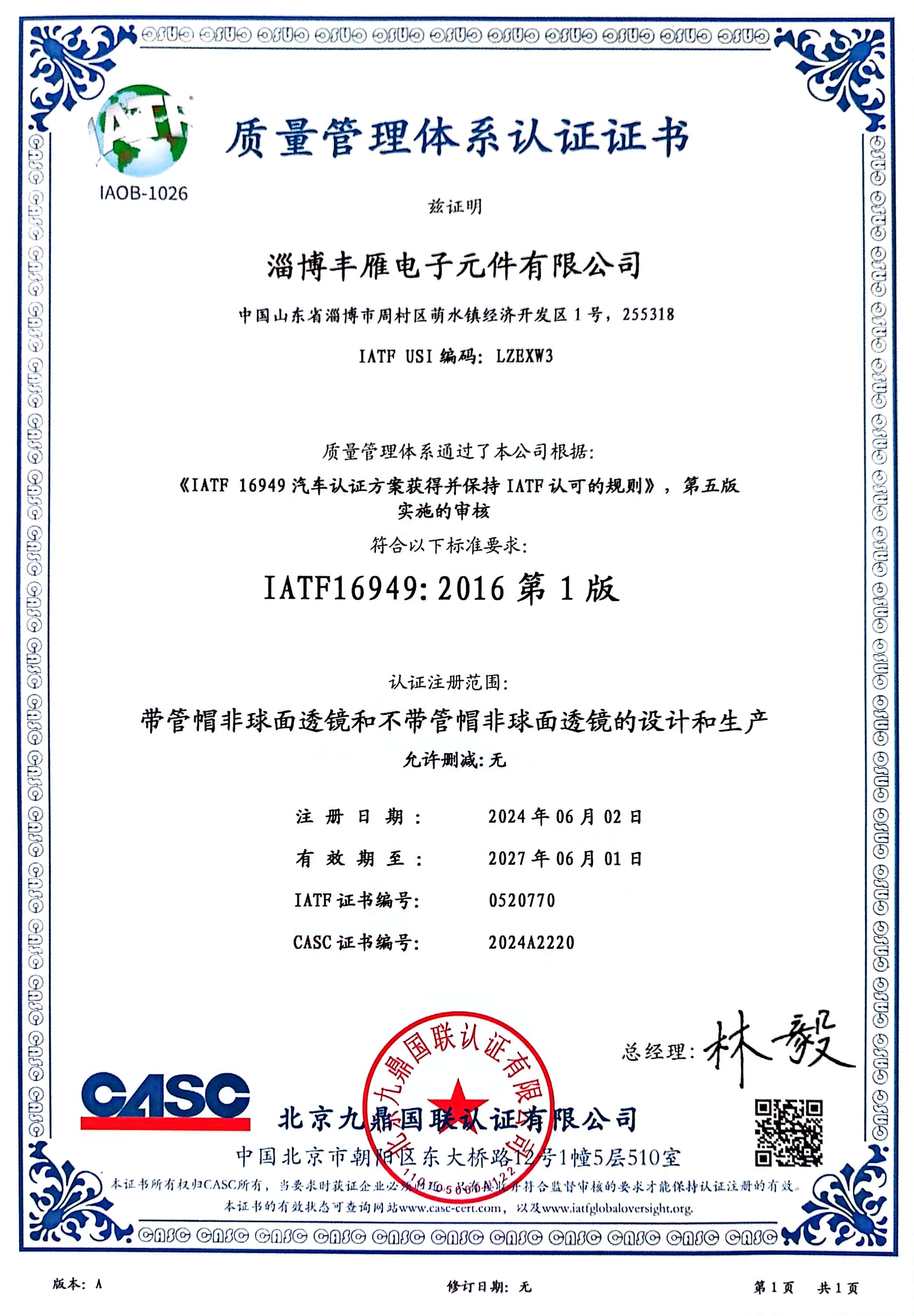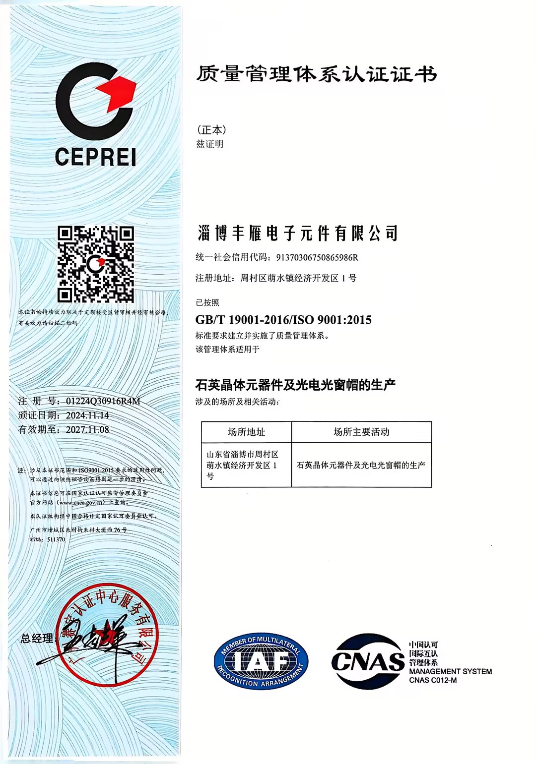 淄博豐雁電子元件有限公司,是一家集研發、生產、銷售為一體的透鏡管帽、晶體諧振器、晶體濾波器的高新技術企業。成立于1992年,坐落于山東省淄博市周村區,注冊資金1000萬元,擁有職工150余人,公司占地35000平方米,其中擁有5000平方的超凈化廠房,并配備了千級凈化工作臺,確保環境的凈化度。公司下設光電事業部,濾波器事業部,晶體事業部等多個事業部。專注為光通訊、激光器領域以及各種電子應用領域進行電子元件配套。公司于1999年通過了ISO9000質量體系認證,公司提供的所有產品符合歐盟的R0HS和REACH標準。公司被認定為淄博市“專精特新”企業、“淄博市企業技術中心”、省級“專精特新”企業、“山東省制造業單項冠軍”。公司擁有持續創新的研發團隊,有常年的外聘技術專家長期指導,并且與國內多所大學和光電研究所保持長期合作關系,確保了產品和技術的先進性,能持續為客戶提供高質量的產品和更好的全方位服務。